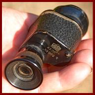 At the end of WWII most binoculars manufacturers (including those in Russia, the UK, Canada and elsewhere that were essentially government operated) usually assembled the binoculars they could from the piles of wartime parts on hand. I think this is probably the case with my 1946 Russian Krasnogorsk state plant binoculars, which have a leather ocular cover, and do not have a graticule/ ranging grid. The Krasnogorsk factory was created in 1942 near Moscow, and still is in operation, and was known for manufacturing Zenit camera products. The “tomb” logo was used by KMZ during the years 1942-1949. |