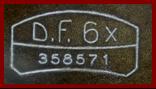 D.F. 03 is Doppel Fernrohr model 1903. Dienstglas is Service Glass. The Nr. Is a property number. UF is Unteroffizier (junior non commissioned officer) Verg.6x is vergr öß erung/ magnification 6x. D.R.P. is Deutsche Reich Patent/ covered by German patent. Oigee DF. 03 binoculars production started around 1908. |