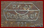 D.F. 03 is Doppel Fernrohr model 1903. Dienstglas is Service Glass. The Nr. Is a property number. UF is Unteroffizier (junior non commissioned officer) Verg.6x is vergr öß erung/ magnification 6x. D.R.P. is Deutsche Reich Patent/ covered by German patent. Oigee DF. 03 binoculars production started around 1908. |